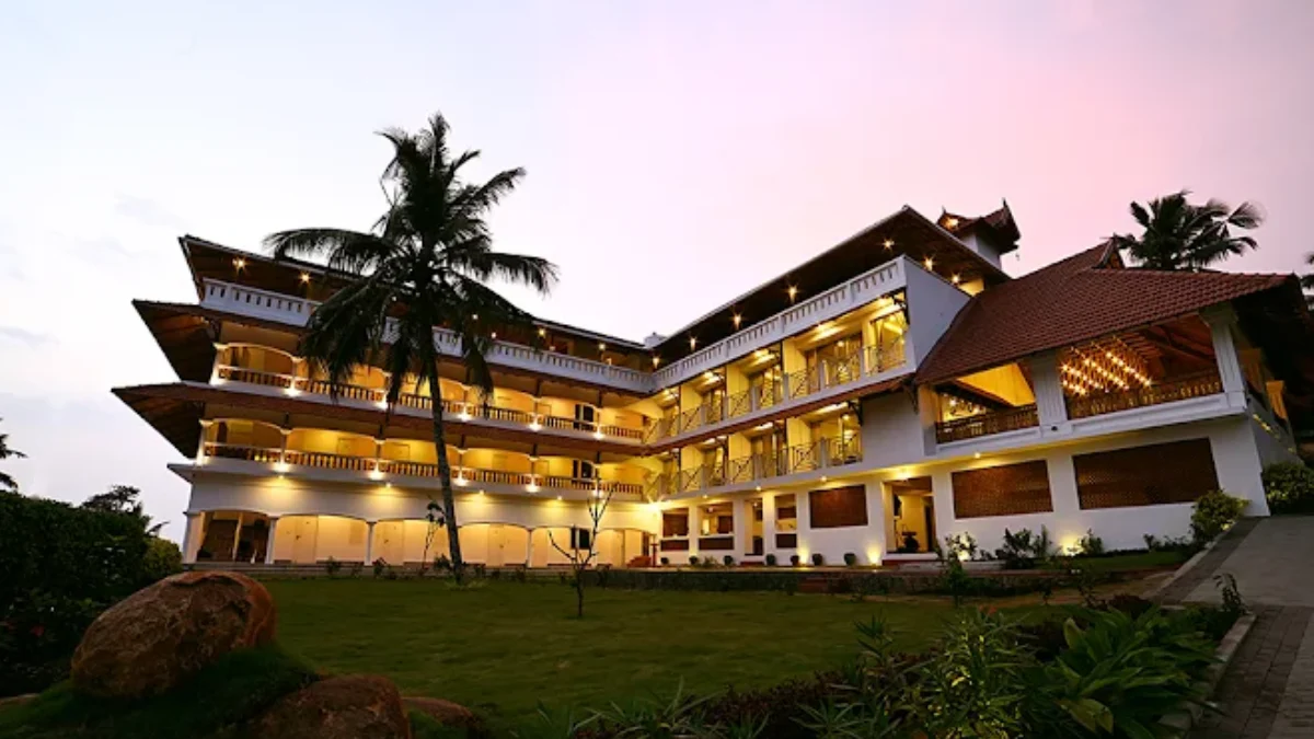 The resort is set on a scenic hilltop in Kovalam, Kerala, surrounded by lush greenery and panoramic views of the Arabian Sea. It offers a perfect blend of luxury, wellness, and relaxation. Guests can enjoy elegantly designed rooms and suites, an infinity pool overlooking the sea, and a restaurant serving authentic Kerala and international cuisine.